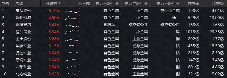 成份股方面,宝钛股份领涨超6%,盛和资源涨超4%,钢研高纳、厦门钨业、金田股份、华友钴业等个股跟涨。