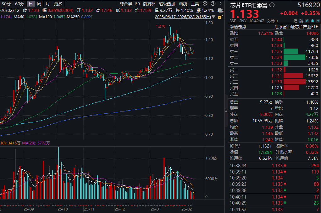 今日,半导体板块盘初拉升,全市场费率最低档的芯片ETF汇添富(516920)一度涨超1%,后冲高回落,现涨0.44%,盘中成交额已超1000万元!