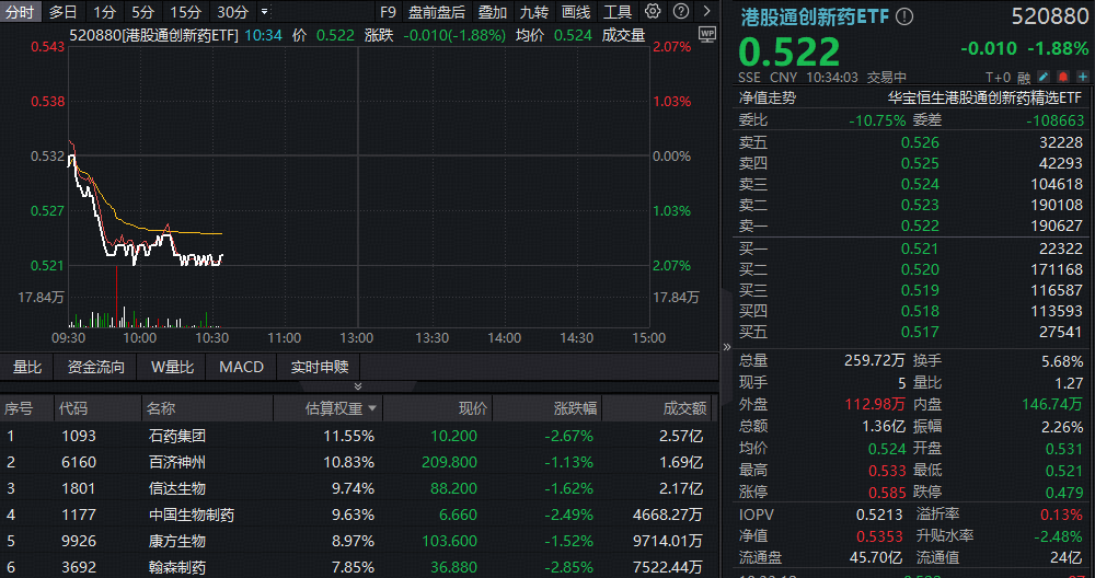 2月12日早盘,港股创新药走低,港股通创新药ETF(520880)一度跌落2%,前十权重集体飘绿,石药集团、中国生物制药、翰森制药等多股跌超2%