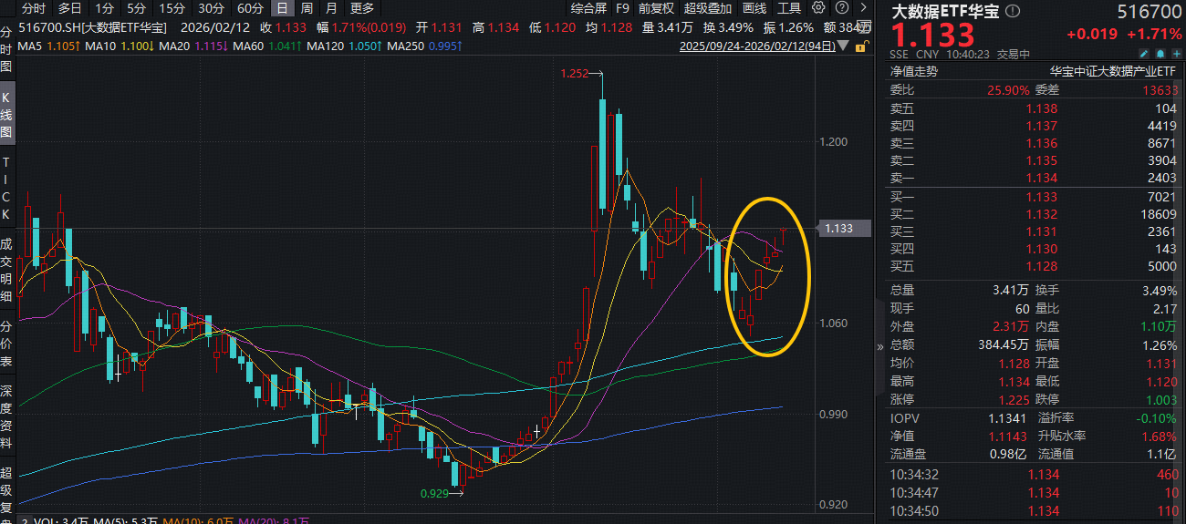 接着奏乐接着舞!今日(2月12日)重点布局国产算力、AI应用领域的大数据ETF华宝(516700)场内价格盘中拉升1.8%,现涨1.71%,冲击日线6连阳