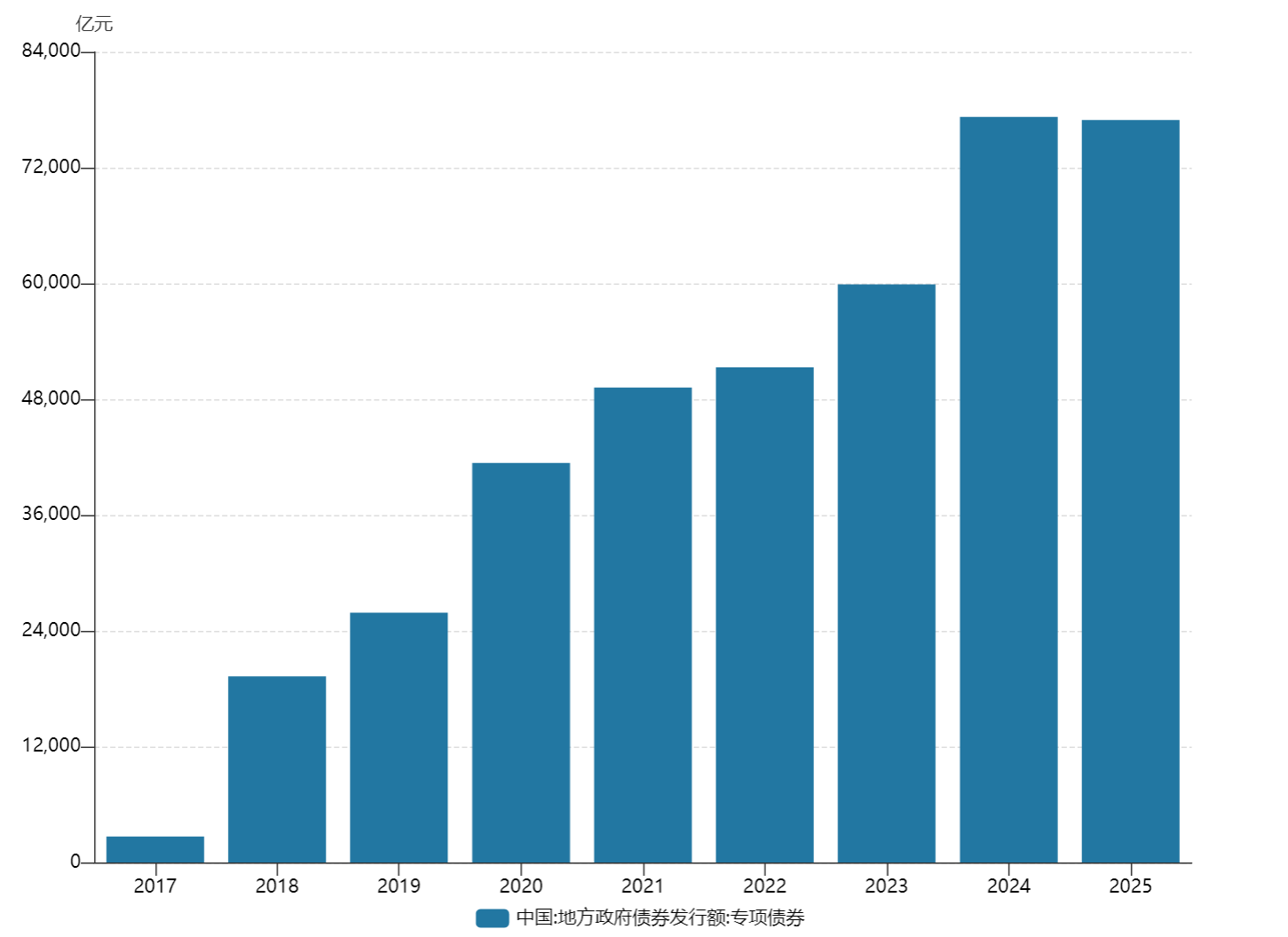 图片趋势描述:从数据趋势分析,地方政府专项债的发行逐年增高,2024、2025年地方政府专项债发放均超过7万亿