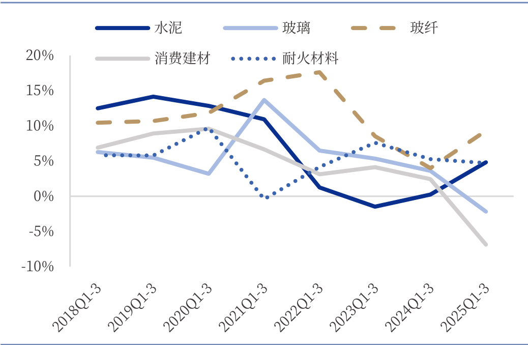 图片趋势描述:从数据趋势分析,供给端的主动收缩有效对冲了需求端季节性波动,2025Q1-Q3年玻纤,水泥毛利率抬升明显