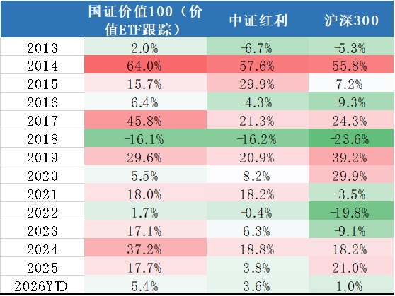从2013年至今,国证价值100指数年化收益18%,优于中证红利的11.3%。国证价值100更亮眼的是它“穿越牛熊的硬实力”,无论市场环境如何均能稳定地表现优于红利,过去的13年中,红利仅在2015年明显跑赢国证价值100。