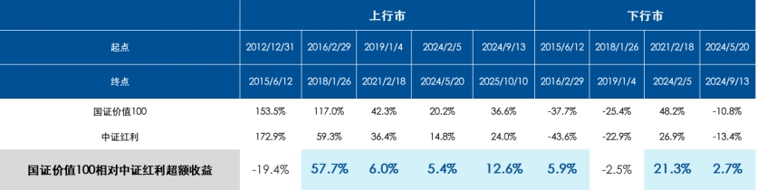 熊市里国证价值100抗跌性突出:2021年至2024年市场连续阴跌,国证价值100涨48.2%,相对中证红利多涨26.9%;2016年至2018年市场上行,国证价值100涨117.0%,相对中证红利多涨57.7%。