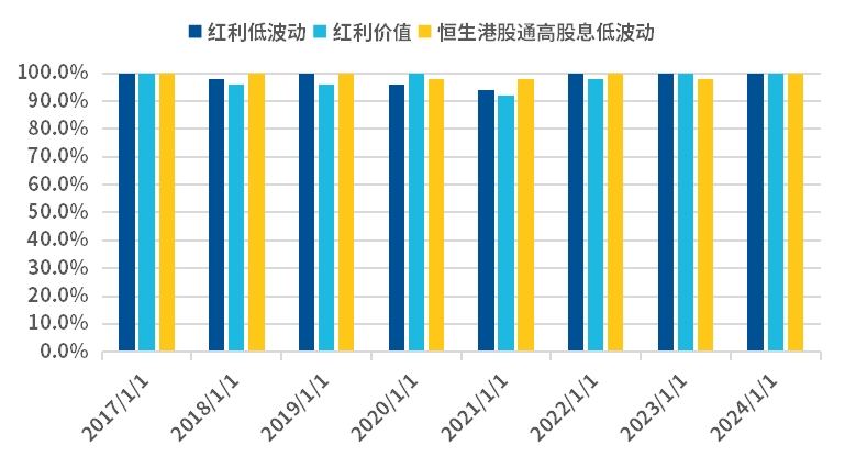 图:红利指数的成份股中分红公司的占比较高,多超过90%