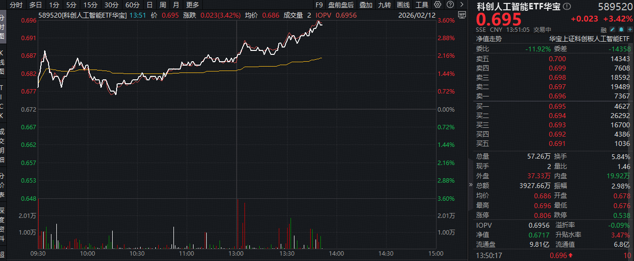 ETF盘中资讯|豆包大模型2.0初定2月14日发布!字节含量29%的科创人工智能ETF(589520)猛拉3.5%,优刻得20CM涨停