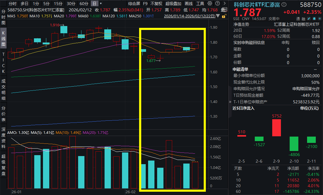 2月12日,A股市场震荡上行,科创芯片板块午后异军突起!截至14:53,科创芯片ETF汇添富(588750)涨超2%,环比小幅放量!