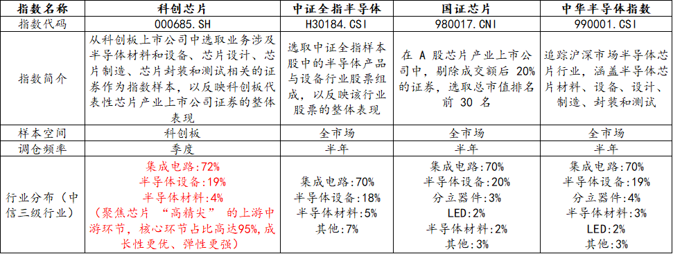 市场上芯片相关指数众多,选取当下热门的科创芯片、半导体等指数进行比较,可以发现,虽然均聚焦为芯片板块,但在指数编制上却大有不同。一句话总结:科创芯片指数聚焦芯片核心环节,“含芯量”更高,弹性强,成长性高