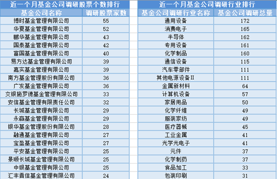 近一个月(1月13日-2月12日),博时基金参与公司调研的数量最多,共调研55家上市公司,此外调研较为活跃的还有华夏基金、鹏华基金和国泰基金,分别调研52家、43家、42家上市公司;从调研行业上来看,基金公司对通用设备行业的上市公司调研次数最多,共有172次,其次是消费电子行业,基金公司调研了165次。