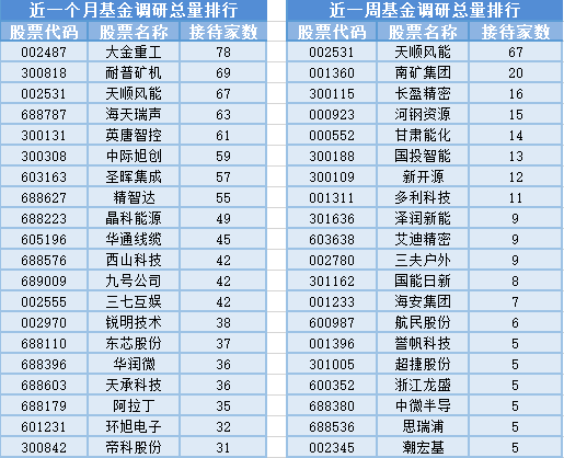 将时间周期缩短到最近一周(2月5日-2月12日)来看,基金调研数量第一的公司是天顺风能,天顺风能属于电气设备行业,主营业务为风塔及零部件、风电叶片及模具、风电海工及相关产品的生产和销售以及风电场项目的开发投资、建设和运营业务。天顺风能共被67家基金机构调研,其次被调研数量较多的股票是南矿集团、长盈精密和河钢资源,分别接受20家、16家和15家基金机构的调研。