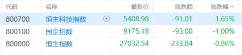 盘面上,大型科技股全线下跌拖累市场情绪低迷,美团、网易跌超4%,百度、腾讯控股跌超2%,快手、小米、京东、阿里巴巴皆有跌幅;内银股、中资券商股、保险股等大金融多数下跌令大市进一步承压;餐饮股走低,九毛九跌超5%,权重股海底捞跌超3%;影视股低迷,英皇文化产业跌近6%;啤酒股、旅游及观光、手游股、云计算、生物医药股等下跌。