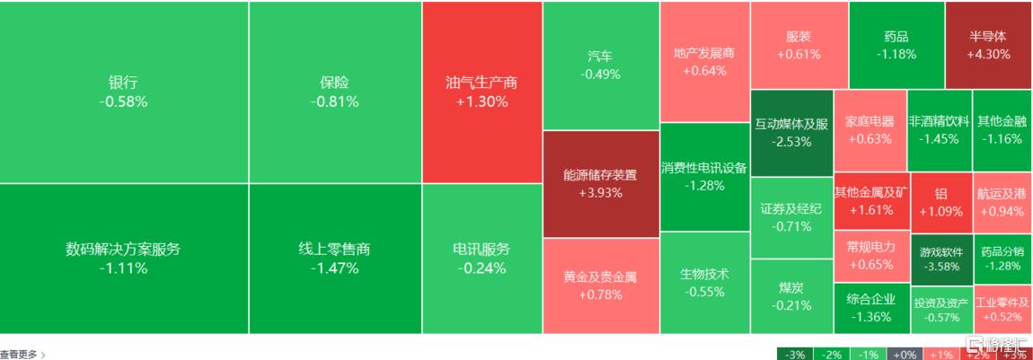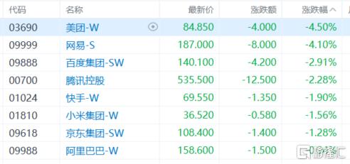 权重科技股集体下跌,美团、网易跌超4%,百度、腾讯控股跌超2%,快手、小米、京东跌超1%,阿里巴巴微跌。