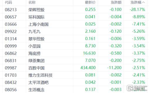 餐饮股走低,九毛九跌超5%,海底捞跌超3%,小菜园、绿茶集团、百胜中国等跟跌。