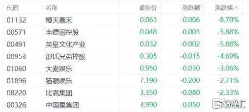 影视股低迷,英皇文化产业跌近6%,邵氏兄弟控股、大麦娱乐、猫眼娱乐、比高集团等跟跌。