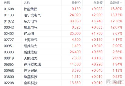 电力设备股走强,哈尔滨电气涨超13%,东方电气、亿华通、上海电气、超威动力、威胜控股、天能动力等跟涨。