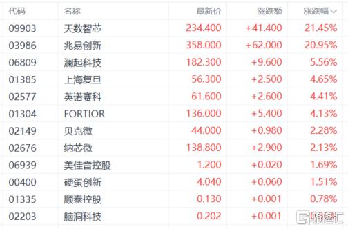 半导体股走高,天数智芯、兆易创新涨超20%,澜起科技、上海复旦、英诺赛科、纳芯微等跟涨。