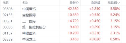 重型机械股继续拉升,中国重汽、森松国际涨超5%,三一国际、第一拖拉机股份、中联重科、中国龙工等跟涨。