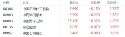 石油股活跃,中国石油化工股份、中海油田服务涨超2%,中国海洋石油、昆仑能源、中国石油股份等跟涨。