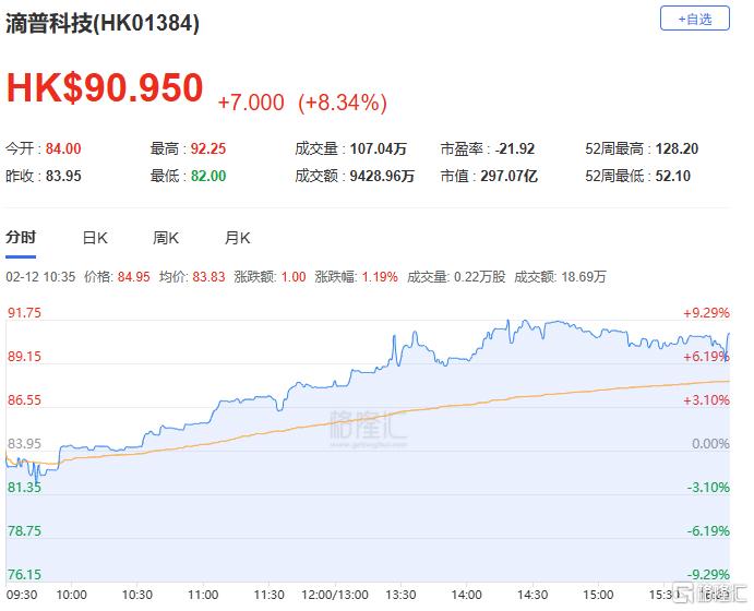 滴普科技大涨8.34%至90.95港元,市值达到297.07亿港元。