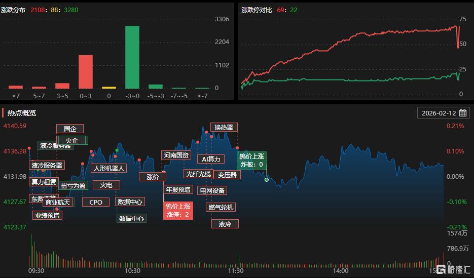 2月12日,A股三大指数集体上涨,全市场成交额2.16万亿元,较前一交易日增量1597亿元。