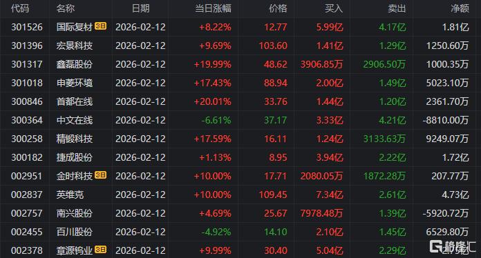 龙虎榜单日净卖出额前三为中文在线、航天工程、三变科技,分别为2.34亿元、1.86亿元、1.54亿元。