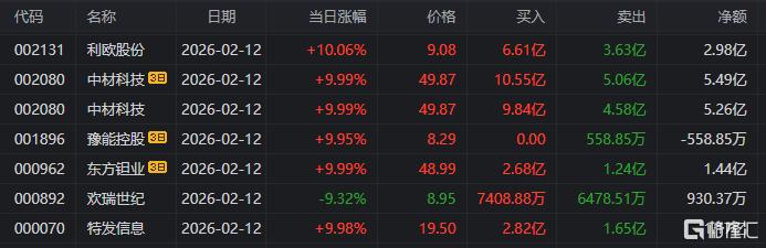 龙虎榜单日净买入额前三为利欧股份、英维克、中材科技,分别为12.90亿元、9.34亿元、5.52亿元。