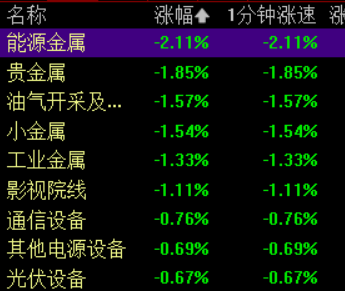 盘面上,能源金属、贵金属、油气、小金属、工业金属、影视院线、通信设备等行业跌幅居前。
