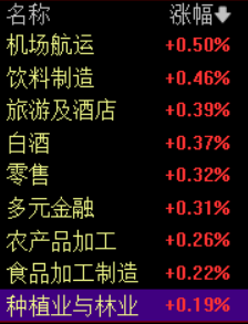 机场航运、饮料、旅游酒店、白酒、零售、多元金融等涨幅靠前。