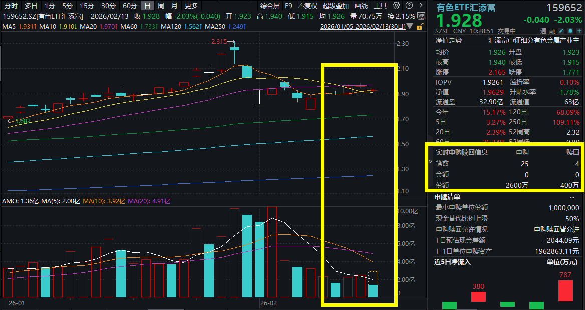 2月13日,A股市场低开震荡,受昨夜黄金、白银、铜等金属回调影响,有色板块回调,截至10:29,有色ETF汇添富(159652)跌超2%,资金逢跌持续涌入,有色ETF汇添富(159652)盘中吸金超3800万元。