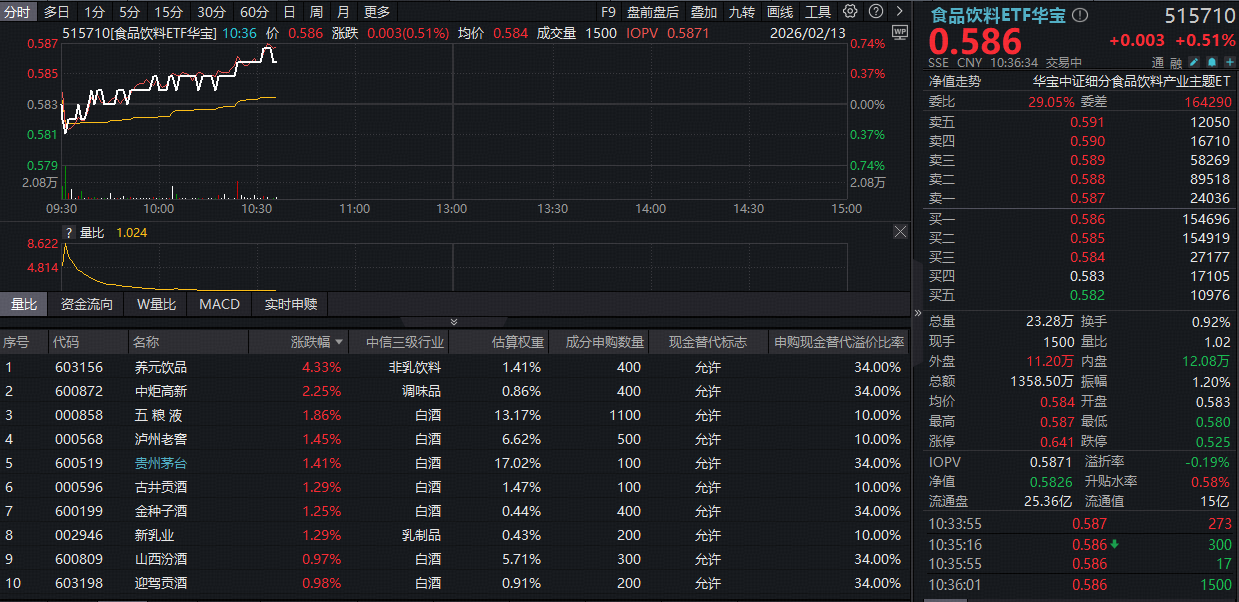 吃喝板块今日(2月13日)逆市上攻!反映吃喝板块整体走势的食品饮料ETF华宝(515710)开盘后震荡走高,截至发稿,场内价格涨0.51%。