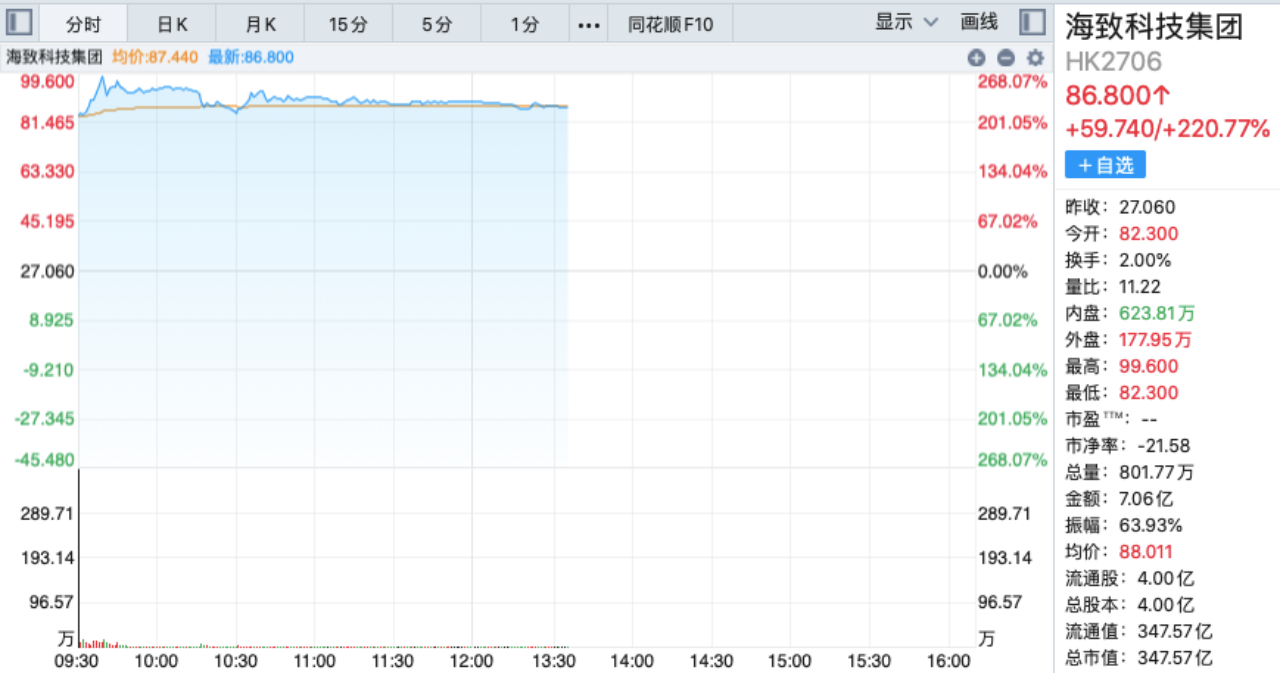 其中,2月13日,海致科技港股上市首日盘中最高涨超260%。截至发稿,该股涨超220%,报86.8港元/股,总市值347.57亿港元。