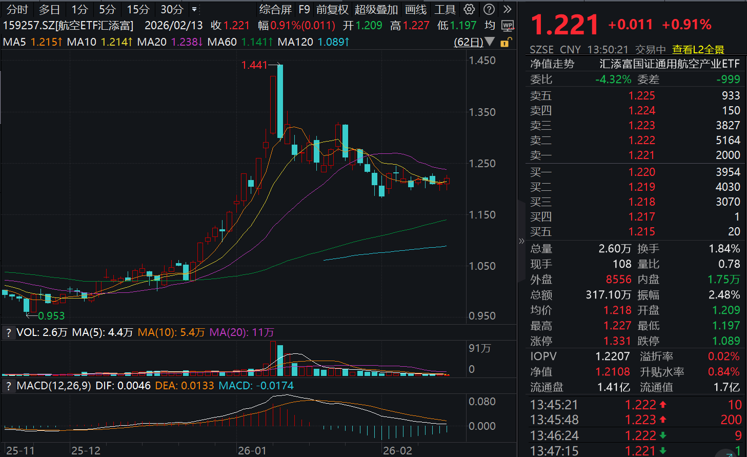 2月13日,A股市场震荡回调,上证指数持续在水下波动,航空板块逆势冲高!截至13:50,航空ETF汇添富(159257)上涨0.91%,冲击两连阳。