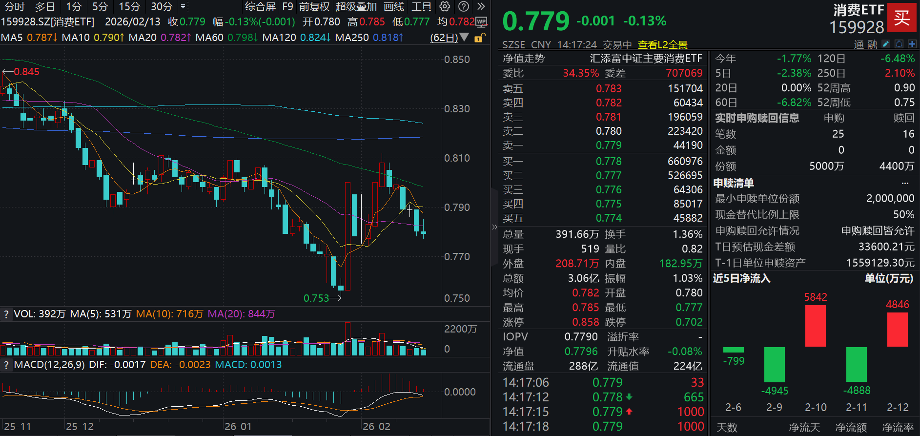 今日(2.13),大消费板块再度回调,规模领先的消费ETF(159928)冲高回落微跌0.13%,成交额已超3亿元!盘中再获资金青睐,净流入600万份。最新规模超224亿元,同类持续领先!
