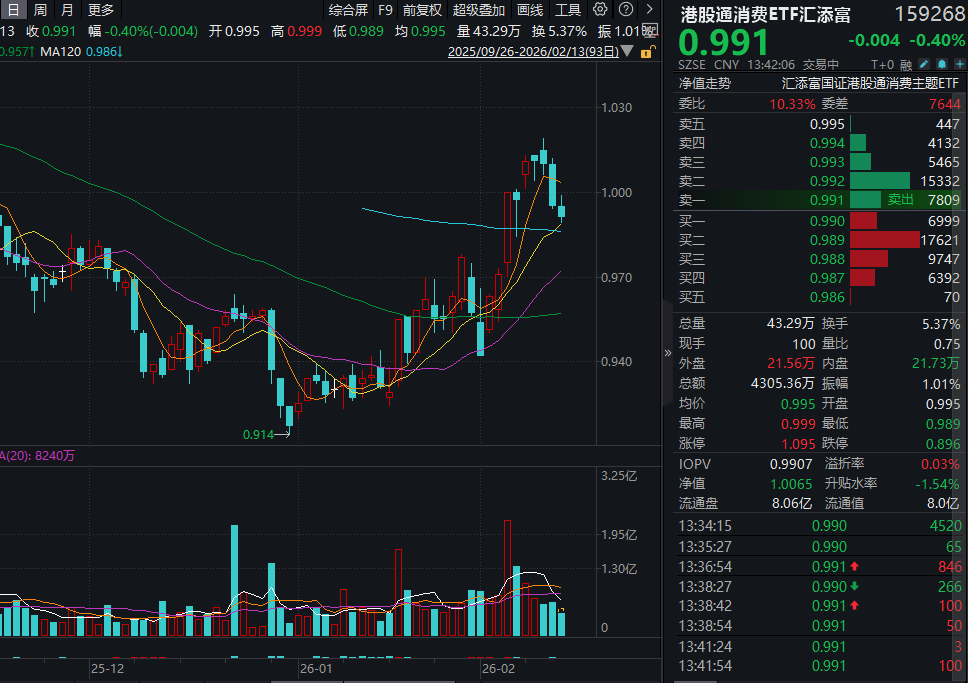 港股方面,聚焦纯正新消费的港股通消费ETF汇添富(159268)跌0.4%连续第三天回调,盘中成交额超4300万元。热门成分股涨跌互现,海底捞涨超3%,中国中免涨超2%,安踏体育、万州国际微涨;下跌方面,老铺黄金跌超6%,思摩尔国际跌超4%,泡泡玛特跌超3%,美的集团微跌。(成分股仅做展示,不作为个股推介)