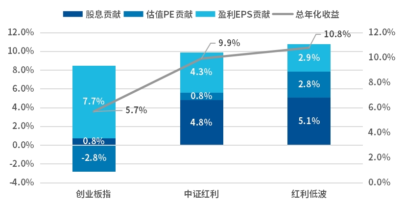 大家平时看到的K线图,大多是“价格指数”,它只反映了股价的涨跌,没算分红。但如果我们看“全收益指数”(就是把分红拿来买了股票,变成更多的股份,也就是前面所说的分红再投资),红利指数的曲线会极其漂亮,如果按照全收益计算,红利低波在过去10年的年化收益为10.8%,中证红利为9.9%,而在历史上经历过多轮大涨后的创业板指仅为5.7%,二者的波动性也差异巨大。