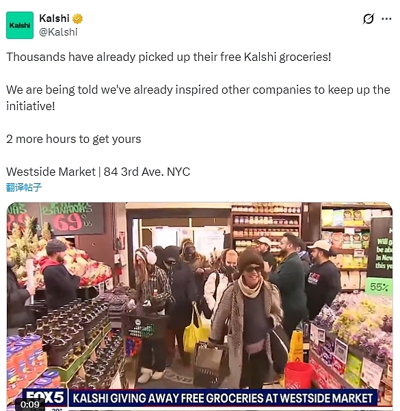 Kalshi 在X上发布了赠送食品杂货的视频,并配文:“已有数千人领取了免费的Kalshi食品!我们听说,这项举措已经激励了其他公司继续推进!还有两小时,快来领取吧!西区市场 | 纽约市第三大道84号。”