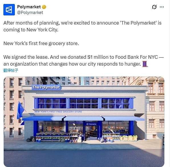 2月4日,Polymarket在X上发文提出了这一设想:“经过数月的筹备,我们激动地宣布“The Polymarket”即将落户纽约市。这将是纽约首家免费杂货店。我们已签署租赁协议。同时,我们也向纽约市食品银行捐赠了100万美元——该机构致力于改变纽约市应对饥饿的方式。”