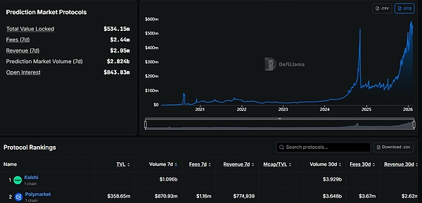 据 DeFiLlama 数据显示,预测市场协议当前锁定总价值高达5.3415亿美元,预测市场7日交易量高达28.24亿美元,未平仓合约8.4383亿美元。其中Kalshi 7 日交易量高达10.96亿美元;Polymarket则稳居其后,7日交易量高达8.7093亿美元。两家预测平台的7日交易量总和已经接近20亿美元,占据了整个预测市场交易量的大半江山。
