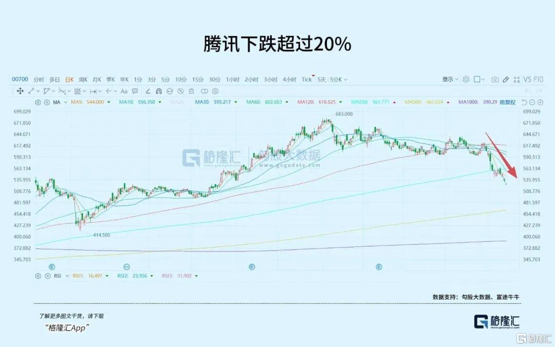 最近的表现确实让人有些揪心,作为港股的“定海神针”,从25年10月的高位回调,至今跌幅已经达23%,市值跌没了1.43万亿,这两周经历了两波非常明显的连续回撤,MA250及以下的技术线,全部击穿。