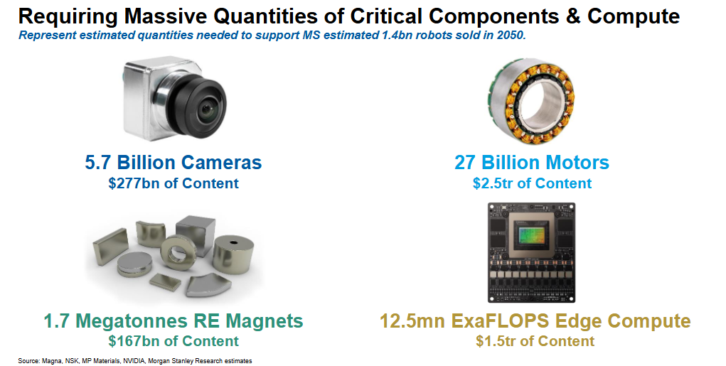 机器人产业的爆发式增长将对上游零部件供应商带来巨大机遇。摩根士丹利长期展望显示,到2050年支撑14亿台机器人销售将需要:57亿个摄像头(较2025年增长95倍)、270亿个电机(增长260倍)、410亿个轴承(增长200倍)、1250万ExaFLOPS边缘计算能力(增长4万倍)、170万吨稀土磁铁(增长480倍)以及26太瓦时电池容量(增长1450倍)。而上游核心零部件的国产替代不仅意味着成本曲线的下移,更代表着产业链利润池向国内转移的结构性红利。