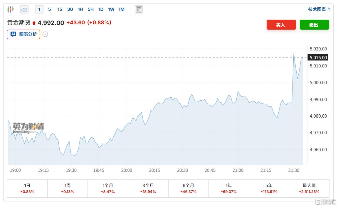 数据公布后,现货黄金快速上涨至4992美元/盎司。