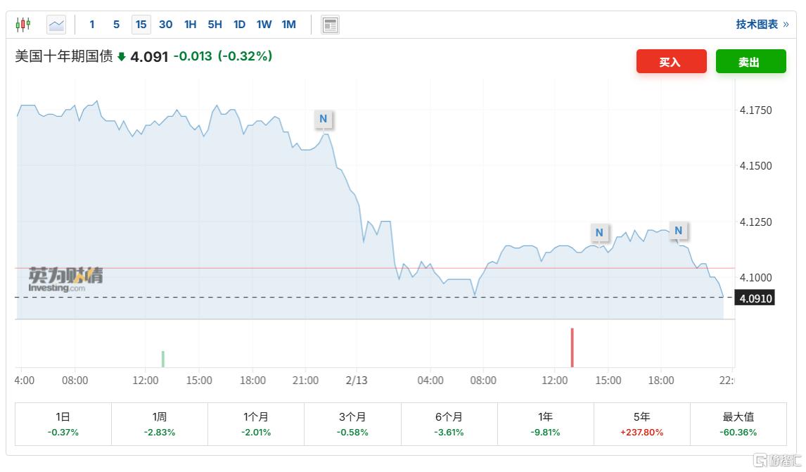 美国国债收益率延续跌势,10年期国债收益率最新下跌至4.091%。