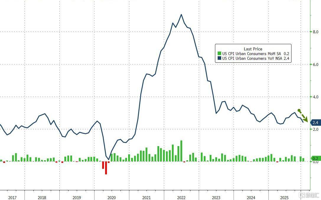 当地时间2月13日,美国劳工统计局公布的数据显示,美国1月未季调CPI年率从2.7%回落至2.4%,创2025年5月以来新低,市场预期中值2.5%。