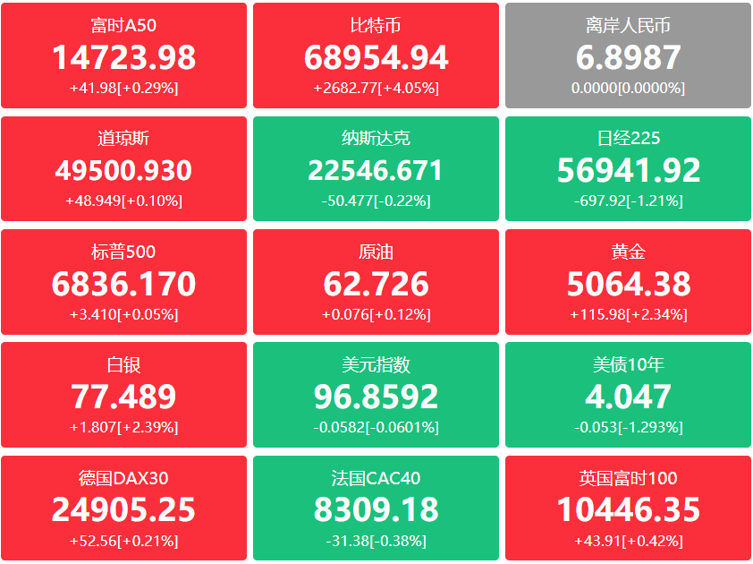 中概股涨跌不一,纳斯达克中国金龙指数跌0.10%,万得中概科技龙头指数涨0.15%。热门中概股方面,再鼎医药涨超6%,腾讯音乐涨逾4%,百胜中国涨超3%,涂鸦智能涨逾2%,禾赛科技涨超2%,网易涨逾2%。跌幅方面,晶科能源跌近3%,阿特斯太阳能跌超2%,陆控跌超2%,金山云跌逾2%,新东方跌超2%,好未来跌约2%,阿里巴巴跌逾2%,理想汽车跌近2%。
