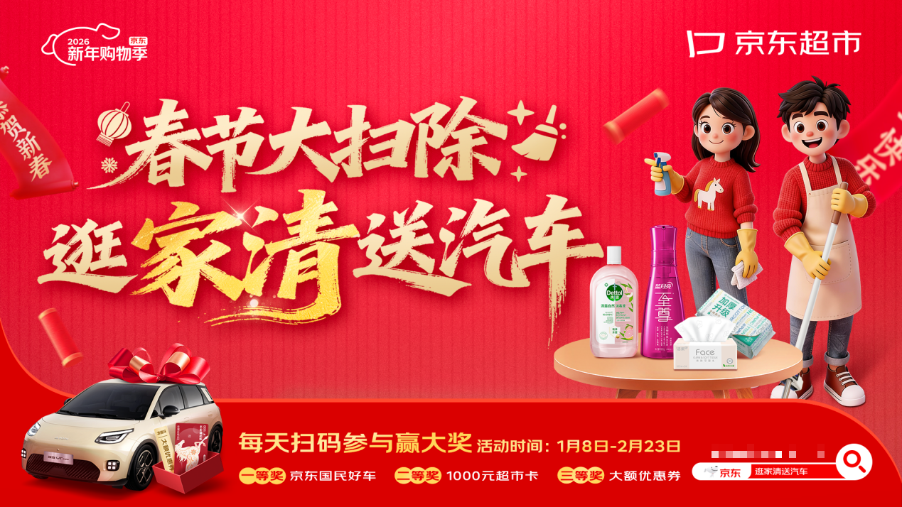 今年年货节,京东超市围绕“包圆马年的2026个心愿”主题推出系列暖心活动,家清品类结合中国传统年末扫尘习俗,打造了“春节大扫除逛家清送汽车”活动,为消费者准备了26辆汽车、海量京东超市卡及优惠券、满减券等多重好礼。