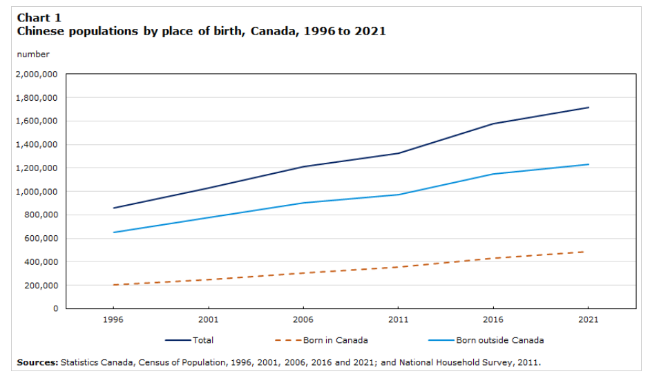 1996年至2021年,加拿大华人人口翻了一番,达到170万人,占加拿大总人口的4.7%。根据最新的人口预测,到2041年,华人人口可能达到260万至350万人,占总人口的6.1%至6.7%。