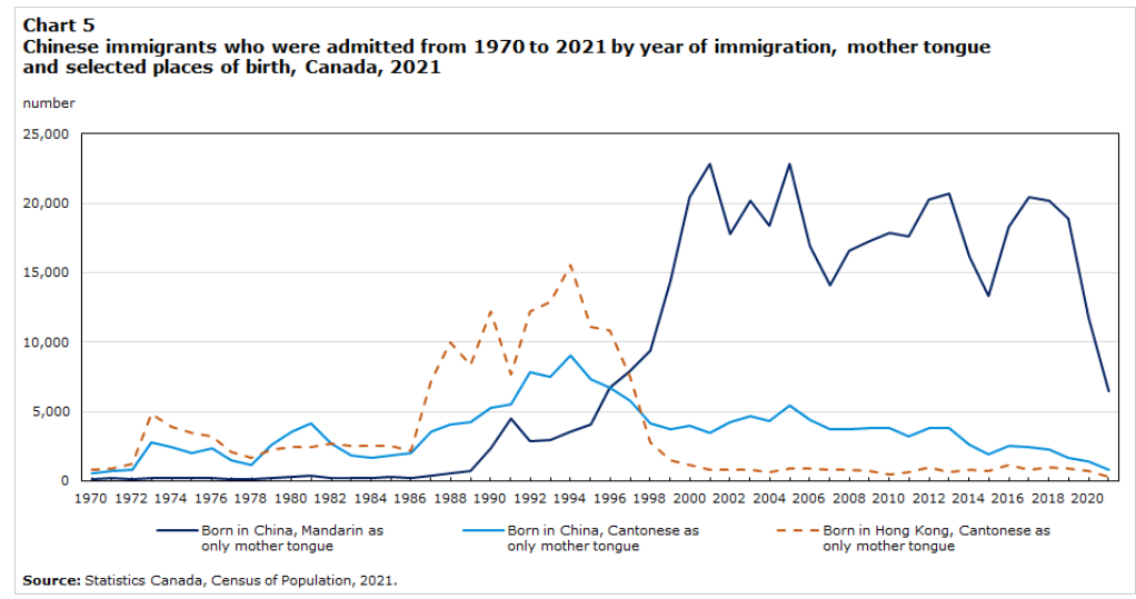 仅以粤语为母语的出生于中国(大陆)的华人,其移民模式与仅以粤语为母语的出生于香港的华人相似。两者最常见的移民年份大约在1990年至1997年之间。相比之下,仅以普通话为母语的出生于中国(大陆)的华人,最常见的移民年份为2000年以后。