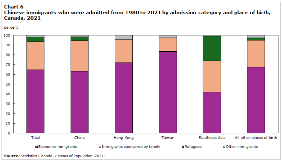 根据2021年人口普查,自1980年以来移民加拿大的华人,主要为经济类移民64.9%或家庭担保移民28.7%。不过,出生于东南亚的华人中,有四分之一25.1%为难民。