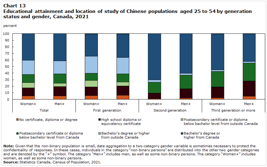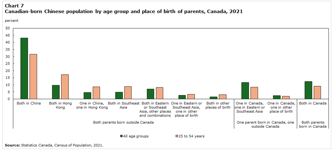 这些父母出生地数据意味着,在本画像后文对25至54岁人口教育和就业情况的分析中,加拿大出生的华人人口中约七成父母并非均出生于中国(大陆)。