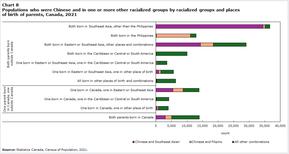 华人与东南亚人组合中约一半49.3%出生于加拿大;华人与菲律宾人组合中为51.6%。而华人与韩国人、华人与日本人、华人与西亚人或华人与阿拉伯人组合中,超过70%出生于加拿大。